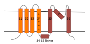 The canonical voltage-gated ion channels, i.e. the voltage-gated potassium (Kv), sodium (Nav), and calcium channels (Cav), are comprised of repeated domains of six transmembrane helices (6TM). In the case of Kv, the channels are formed by four identical 6TM protomers, making the channel a four-fold symmetric tetramer. In the cases of eukaryotic Nav and Cav, the four 6TM subunits are expressed in tandem in a single polypeptide. The transmembrane helices of these channels are referred to as helices S1 through S6 (Fig.1). Helices S1, S2, S3 and S4 form the voltage-sensor domain (VSD, orange in Fig.1) and helices S5 and S6 form the pore domain (brown in Fig.1). The S4 helix is special in that it contains the gating-charge amino acid residues. The positively charged side chains (represented as “+” in Fig.1) of these gating-charge residues are responsible for sensing changes in electrical potential across the membrane (Aggarwal & MacKinnon, 1996).
