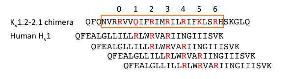 Figure 2. The register problem. Four of several possible alignments for the S4 helices of the Kv1.2-2.1 paddle chimera and human Hv1. The gating charge residues are shown in red. The amino acid residues of the S4 helix from the structure of Kv1.2-2.1 paddle chimera are boxed in orange. The exact boundaries of the human Hv1 S4 helix are unknown.