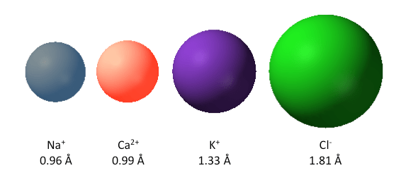 Figure 3. The relative sizes of the most prevalent inorganic ions of cells. The numbers represent the the ionic radii in Angstroms (10-10 m). Not shown is the proton which has a radius of 0.8775 fm (10-15 m).