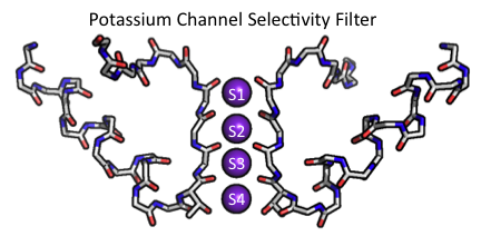 It is via dehydration in these four biding sites that the selectivity for K+ is achieved (Zhou et al., 2001). In the absence of  K+ the selectivity filter undergoes a conformational change making it non-conductive (Zhou et al., 2001; Zhou et al., 2003). Much work has been done to understand the exact mechanism of selectivity but my purpose here is just to introduce the idea and to show what an ion channel selectivity filter looks like. For more information and reviews on channel selectivity please see: Doyle et al., 1998; Gouaux & MacKinnon, 2005Alam & Jiang, 2008Ye et al., 2010; Roux et al., 2011.