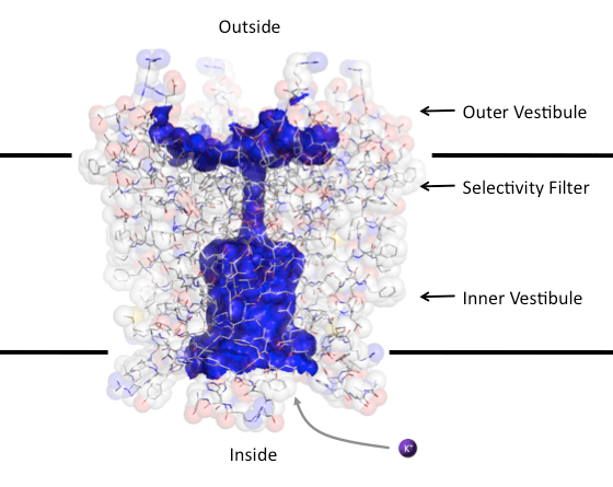 Charged atoms and molecules cannot easily traverse the cell membrane. The hydrophobic interior of the membrane is unable to stabilize the charge of the ion whereas polar water molecules can orient around the ion stabilizing its charge. This basically means that ions stay in water and are unable to penetrate the cell membrane. So how do ion channels make it easier for the ions to cross the membrane? These proteins span the membrane and generate water filled pores that allow water molecules to stabilize the ions as they pass through the membrane. In addition, the polar properties of the amino acid residues making up the protein main chain, side chains and secondary structure (helix dipoles) contribute to stabilizing the ions (Gouaux & MacKinnon, 2005). Fig.1 shows the open pore of the voltage-gated K+ channel (Long et al. 2007).