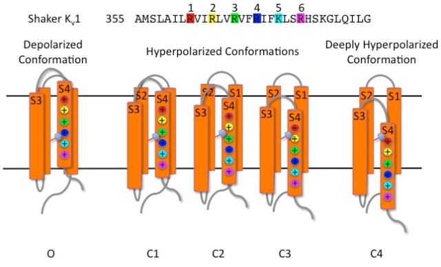 Figure 1. Cartoons showing the different putative conformations of the Shaker Kv VSD. The sequence of the S4 transmembrane helix is shown at the top. The S4 arginines are color coded as in the cartoons. The model designations for the different conformations are show below each cartoon.